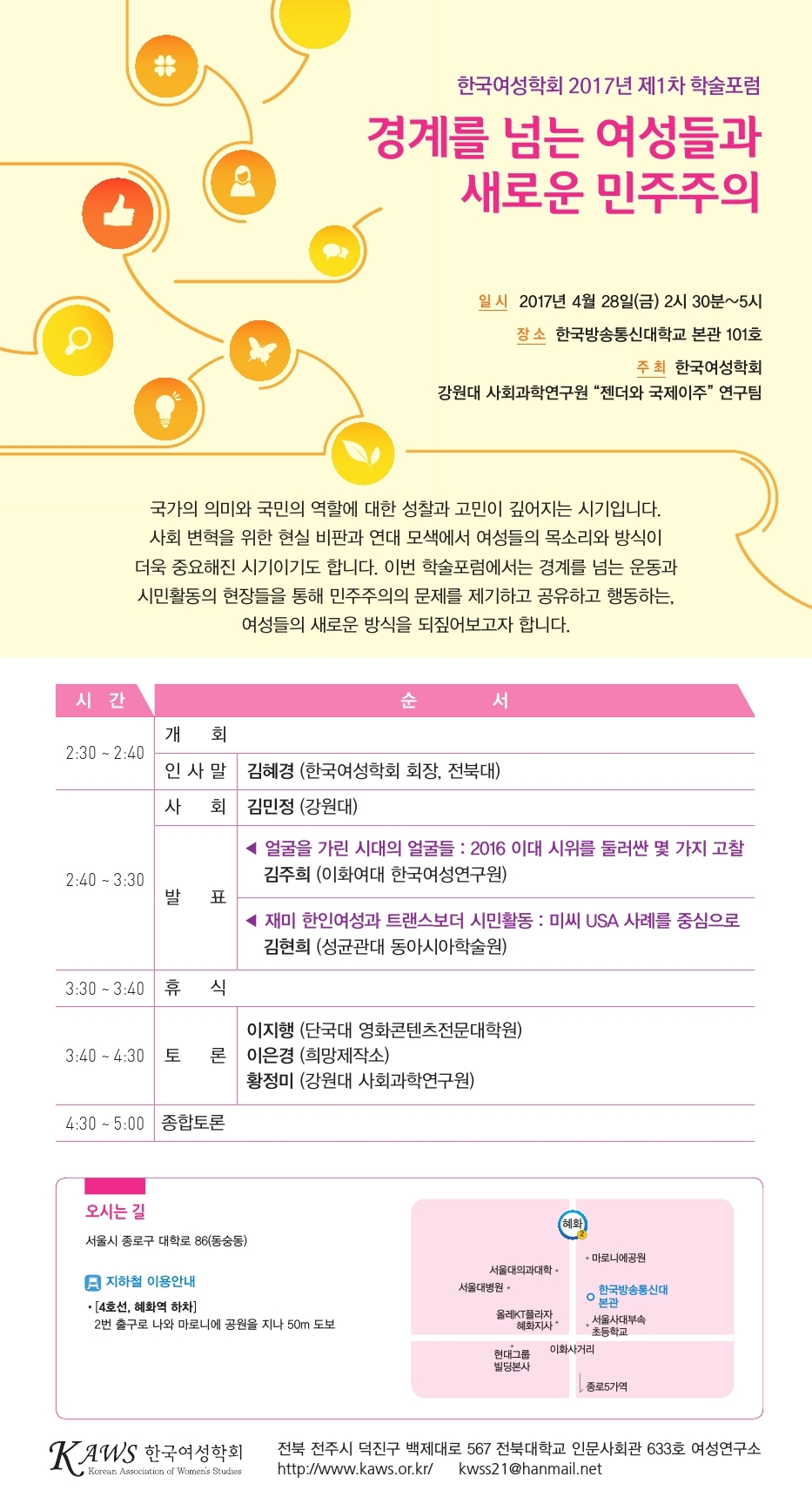 2017 한국여성학회 제1차 학술포럼 안내 "경계를 넘는 여성들과 새로운 민주주의"